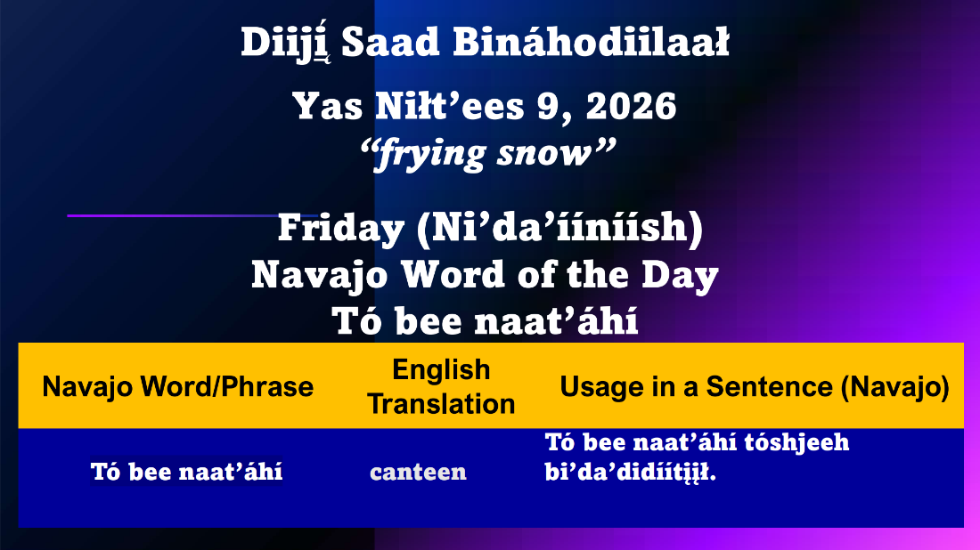 Ashton Brown / Friday, January 9, 2026 / Categories: Announcements, 2026, Jan, Navajo-Word-of-the-Day, 2026, Jan Friday, January 09, 2025 - Word of the Day Department of Dine Education Navajo Word of the Day Archives Thursday, January 08, 2025 - Word of the Day Print 12