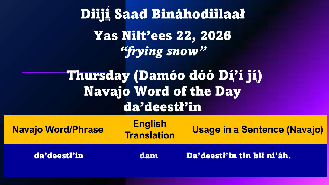 Ashton Brown / Thursday, January 22, 2026 / Categories: Announcements, 2026, Jan, Navajo-Word-of-the-Day, 2026, Jan Thursday, January 22, 2026 - Word of the Day Department of Dine Education Navajo Word of the Day Archives Wednesday, January 21, 2026 - Word of the Day Friday, January 23, 2026 - Word of the Day Print 139